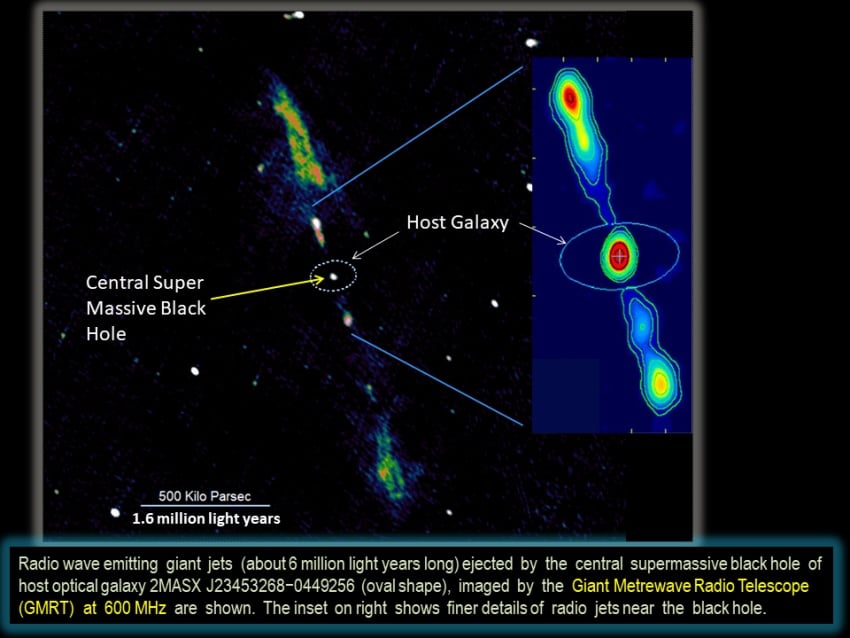 A team of astronomers from CHRIST University in Bangalore have been studying a spiral galaxy with the catchy name '2MASX J23453268−0449256' nearly one billion light-years away. It's one that hosts a supermassive black hole billions of times the mass of our Sun and generates a radio jet that stretches out for six million light years. It's discovery raises questions bout the jet formation process because they are typically associated with elliptical galaxies instead.