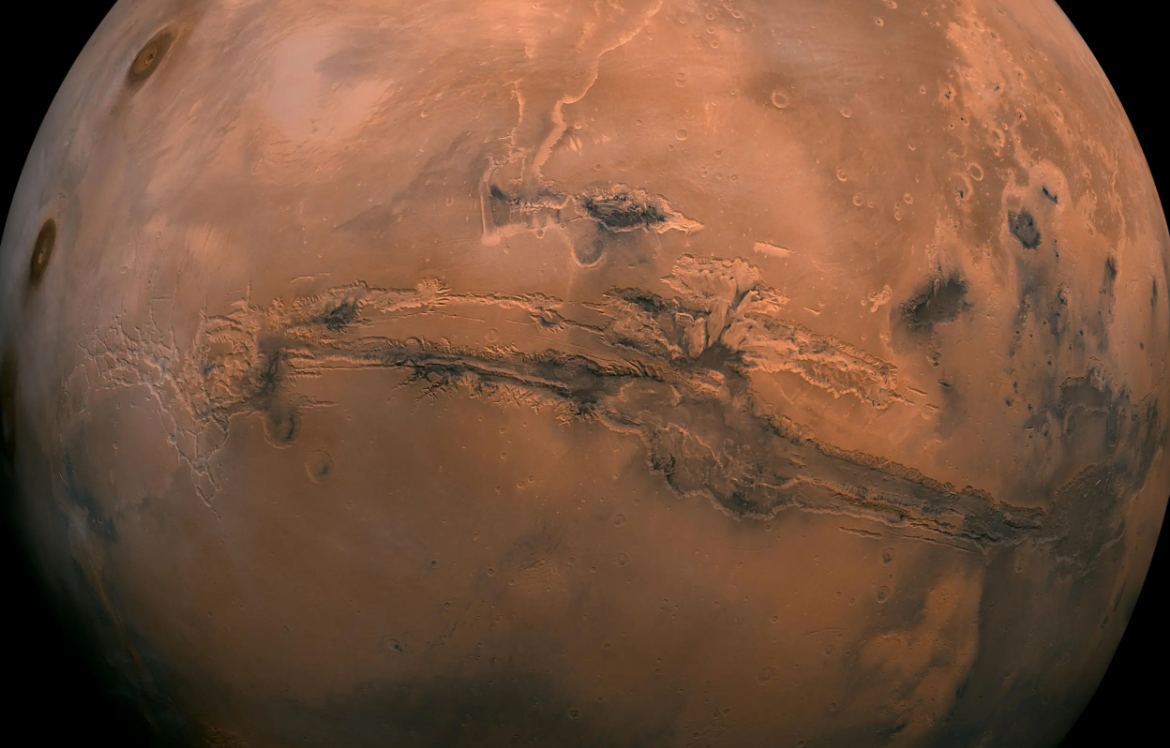 Valles Marineris (VM) is named after NASA's Mariner 9 spacecraft, which discovered the massive canyon in 1971. It's about 4,000 km long, 8 km deep at its deepest point, and 600 km wide in some places. These measurements dwarf the Grand Canyon in the USA.