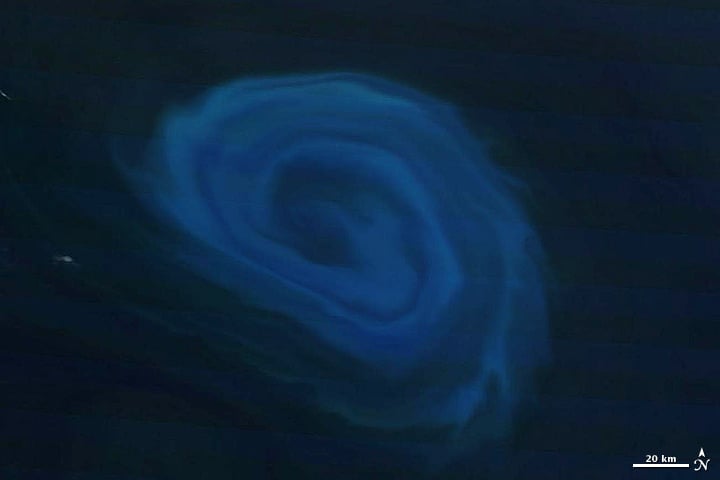 The blue color is created by blooms of phytoplankton, fertilized by the nutrient-rich deep water drawn up by the 150-km-wide eddy.