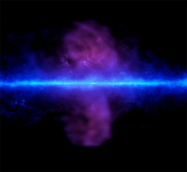 The flash wasn't the only result of the consumption of the hydrogen cloud. There was also a massive outpouring of plasma, in the form of Fermi Bubbles. The Fermi Gamma-Ray Space Telescope found them in 2010. They're enormous bubbles of plasma that protrude from the flat plane of the Milky Way, about 25,000 light years in each direction. These bubbles are millions of times more massive than the Sun, and they emit gamma radiation at a higher energy level than the Milky Way.