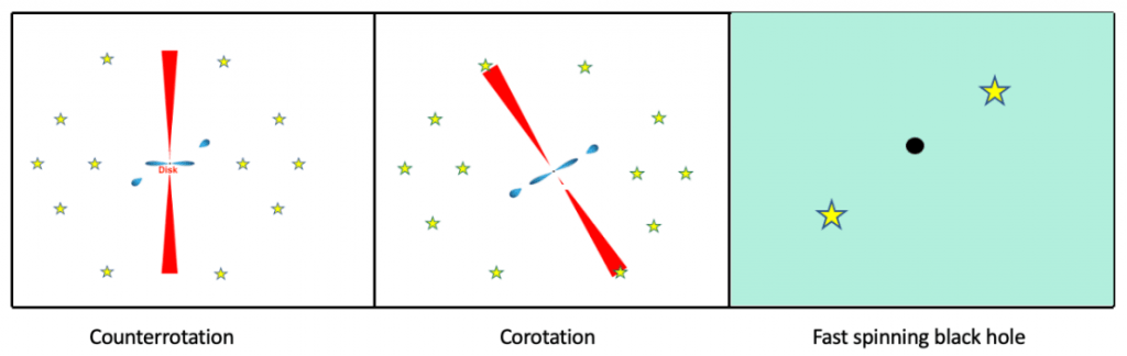 Sometimes a black hole's accretion disk is counter-rotating relative to the black hole itself as a result of a merger, and that affects the feedback and the jets. "Counterrotation is associated with various general relativistic effects that maximize the power and collimation of the jet," Garofalo writes. "This type of jet is funnelled through the cold gas and pushes it into states of higher densities, thereby triggering star formation."