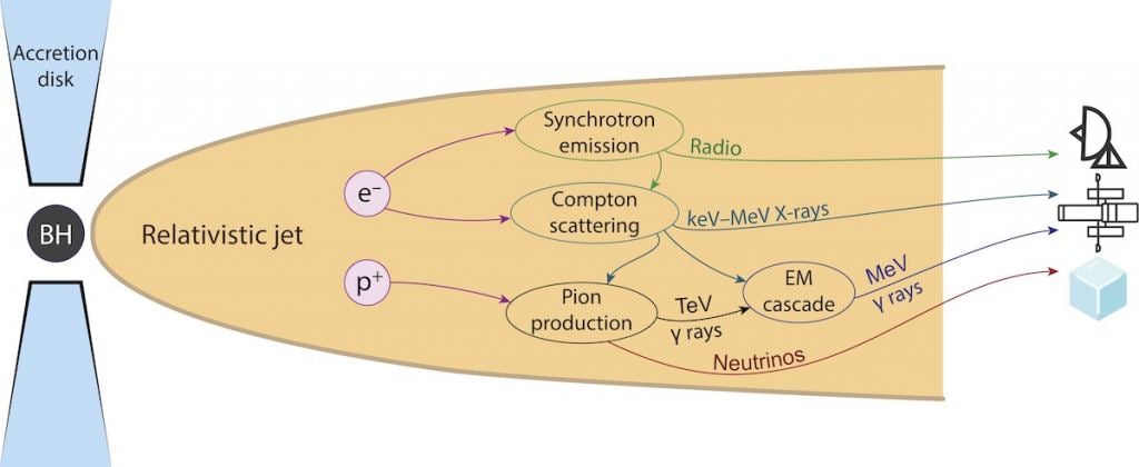 To explain this, the team proposed a rough model. Strong radio quasar bursts occur when hot, ionized gas near the black hole flows through strong magnetic fields. The charged particles are accelerated, causing them to emit radio light. But a rapid flow of dense plasma also causes nuclei and electrons to collide with each other. The high-energy collision of protons can create pions, which emit gamma rays and neutrinos when they decay.