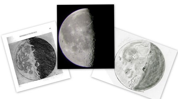 A collage of 21-day old Moons, sketched by Galileo, (left), an image from Jane Houston Jones' telescope, center, and Jane's sketch, right.