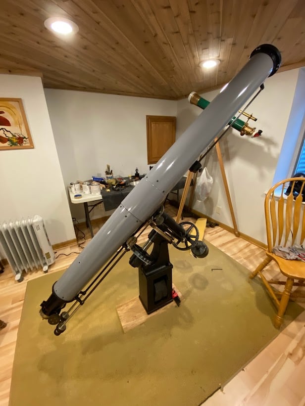 "I wanted to keep the telescope to the original color scheme—(with a) grey telescope tube and satin black mount, castings, and machined parts. I stripped and removed the original paint on all the component surfaces, removed dents and soldered the sheet-metal tubes where needed.