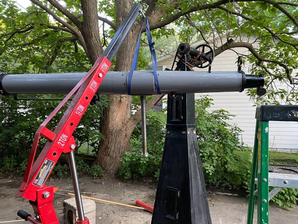 "The cast iron mount base assembly weighs over 60 kilograms. The tube assembly weighs another 60 kilograms, and needed to be lifted in place over 2 meters in the air onto the pier. An engine hoist and block and tackle tied to our Catalpa Tree were used to hoist the parts into place. The weight-driven clock drive was installed and mechanically integrated into the Right Ascension worm gear drive assembly. Finally, the lens was cleaned up and installed in the front tube of the telescope."