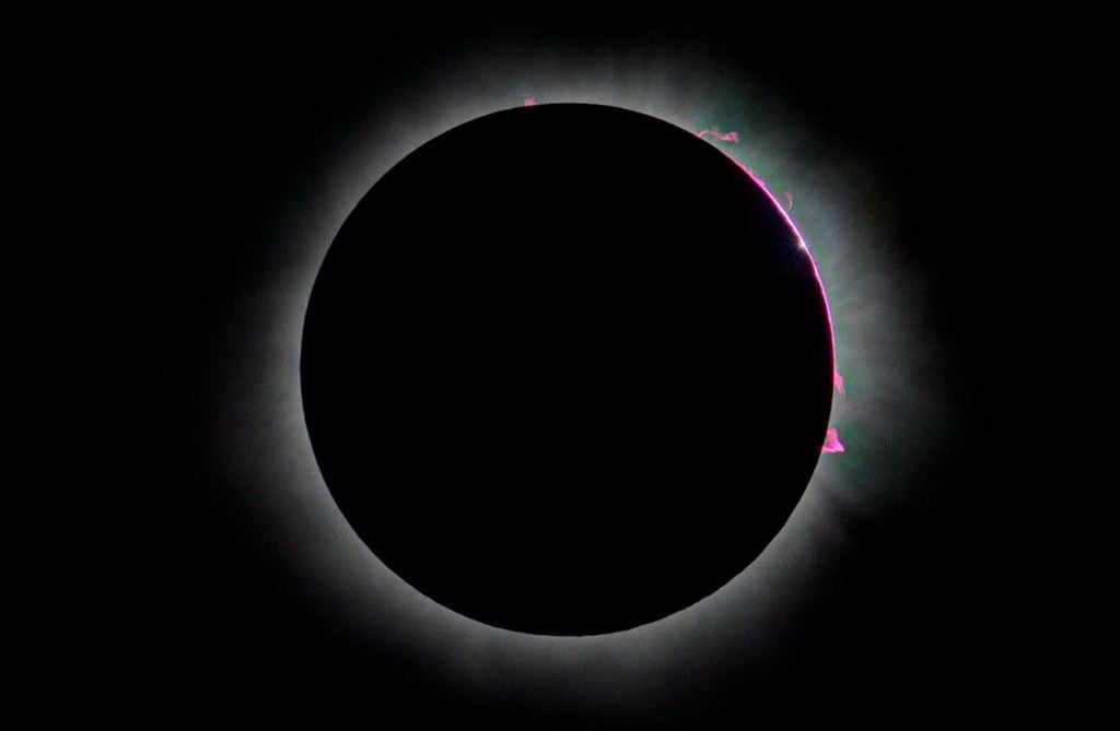 Astrophotographer Andrew Symes also had a memorable view from Cornwall, Ontario. "While I've seen many beautiful photos and videos from many sources, they don't match what those us there in person saw with our eyes," Symes told *Universe Today*. "The sky around the Sun was not black but a deep, steely blue. The horizon was lighter--similar to what you'd see during a sunset or sunrise--but still very alien."