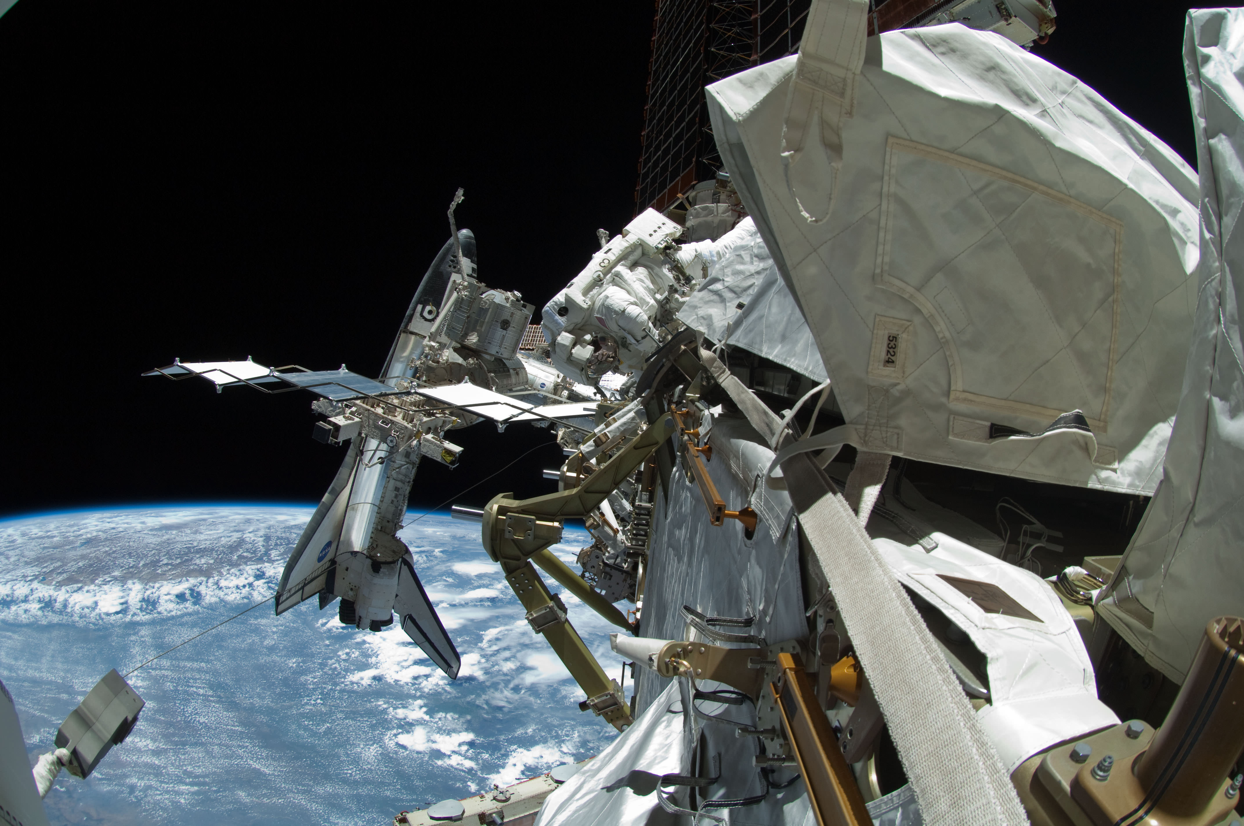 [caption id="attachment_86024" align="aligncenter" width="580" caption="A portion of the ISS and docked Space Shuttle Endeavour. This image was photographed by a spacewalker, using a fish-eye lens attached to an electronic still camera, during the STS-134 mission's fourth extravehicular activity (EVA). The blackness of space and Earth's horizon provide the backdrop for the scene. Credit: NASA"]