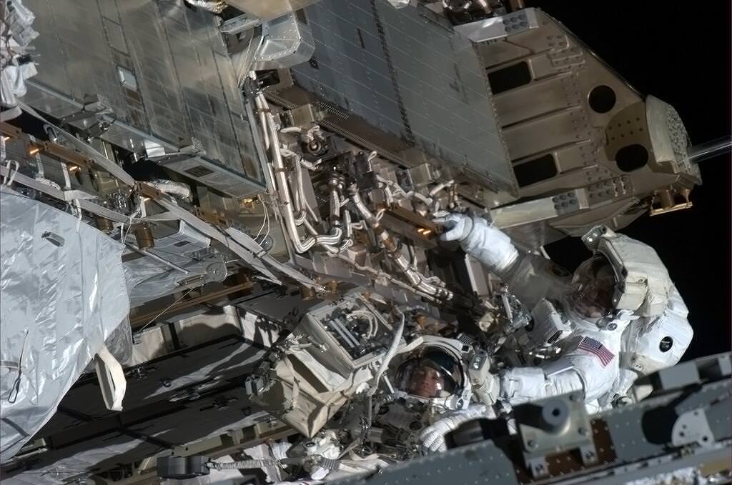 Cassidy and Marshburn work outside the ISS in the 'approaching orbital sunset, the harshest of light, a blackness like endless velvet,' said Hadfield. Credit: NASA/CSA/Chris Hadfield. [/caption]