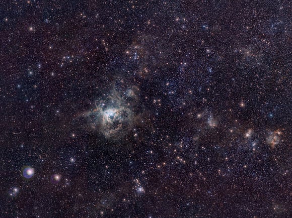 The wide-field image shows a host of different objects. The bright area above the centre is the Tarantula Nebula itself, with the RMC 136 cluster of massive stars in its core. To the left is the NGC 2100 star cluster. To the right is the tiny remnant of the supernova SN1987A (eso1032). Below the centre are a series of star-forming regions including NGC 2080 — nicknamed the "Ghost Head Nebula" — and the NGC 2083 star cluster.