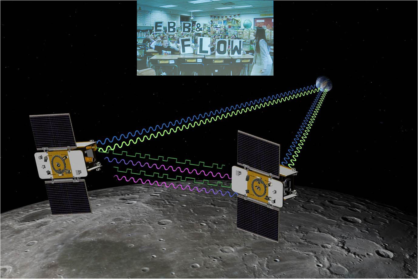 As they fly over mountains, craters and basins on the Moon, the spaceships will move back and forth in orbit in an "ebb and flow" like response to the changing lunar gravity field and transmit radio signals to precisely measure the variations to within 1 micron, the width of a red blood cell.