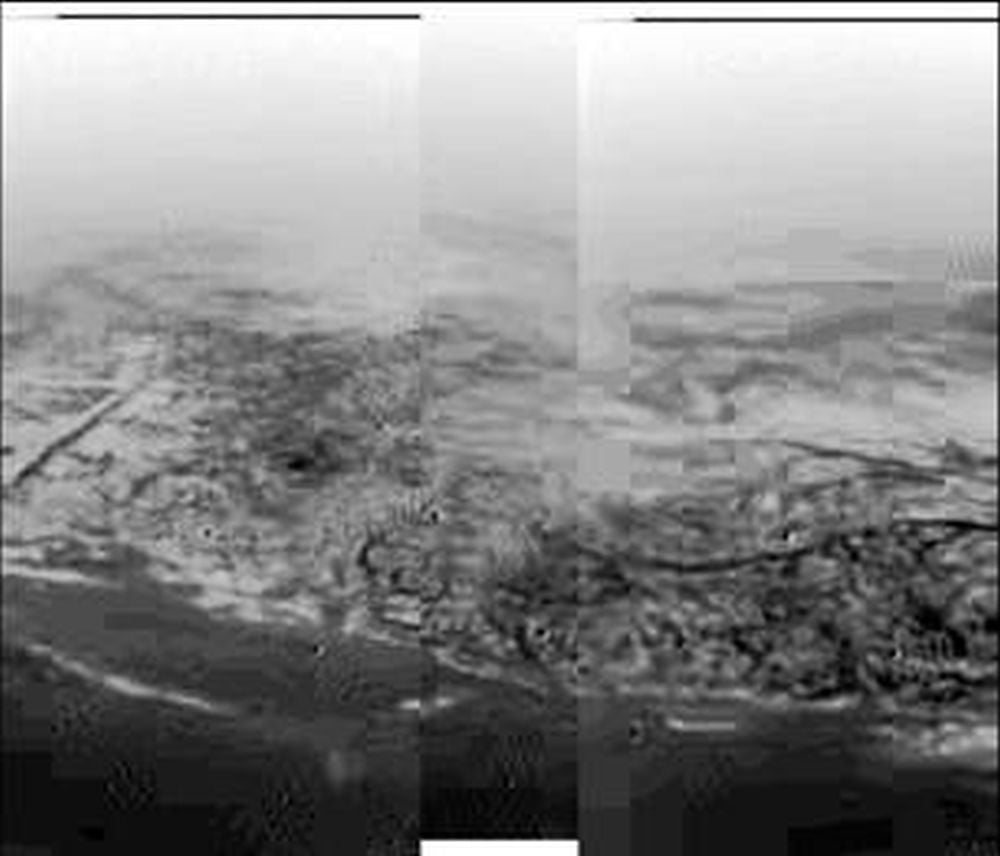 *We don't have great images of Titan's surface, but the ESA's Huygens probe captured some images during its descent. This composite image is made from images taken from about 8 km above the surface. Each pixel is about 20 meters. No impact craters are visible. Image Credit: NASA/ESA*