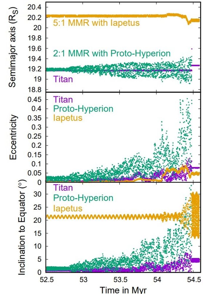 When Saturn's spin-orbit resonance with the other planets was broken, Hyperion was also formed, according to the simulation results. The researchers propose that the additional moon was an outer, mid-sized satellite that they're calling "proto-Hyperion." The breaking of Saturn's spin-orbit resonance destabilized proto-Hyperion, and it collided with proto-Titan. This happened about 400 million years ago.