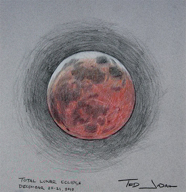 What do you do if you're watching the lunar eclipse but don't have your camera? Make a sketch, just like the astronomers of old. Amateur astronomer Ted Judah from California enjoyed the eclipse, but since he was away on a trip with his family and "there was no room for my astrophotography equipment in the car," he said, Ted resorted to drawing what he witnessed. Lovely.