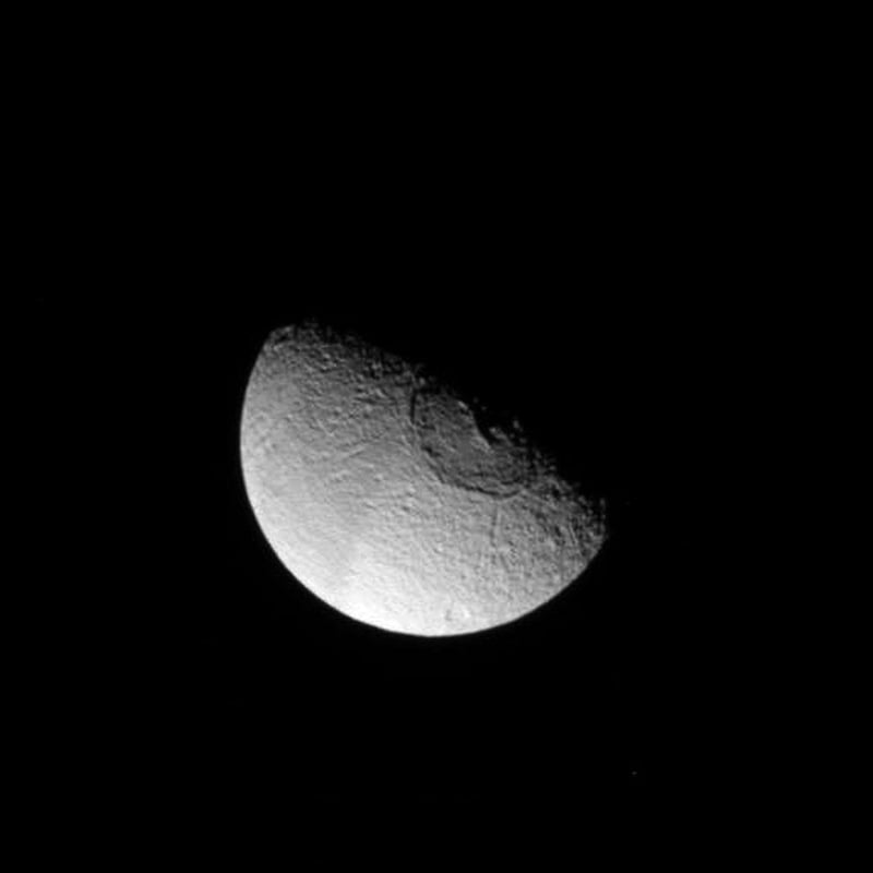 spacecraft passed by Tethys, a 1,062-kilometer (662-mile) -wide moon of Saturn that's made almost entirely of ice. Tethys is covered in craters of all sizes but by far the most dramatic of all is the enormous Odysseus crater, which spans an impressive 450 kilometers (280 miles) of the moon's northern hemisphere -- nearly two-fifths of its entire diameter!