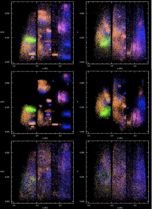 of the size distribution of asteroid families using data from the Sloan Digital Sky Survey. Asteroid families often have distinctive optical colors, the team said, and they were able to offer an improved way to separate out the family members into their colors. This resultant animation put together just this week by Parker shows the orbital motions of over 100,000 asteroids, with colors illustrating the compositional diversity and relative sizes of the asteroids.