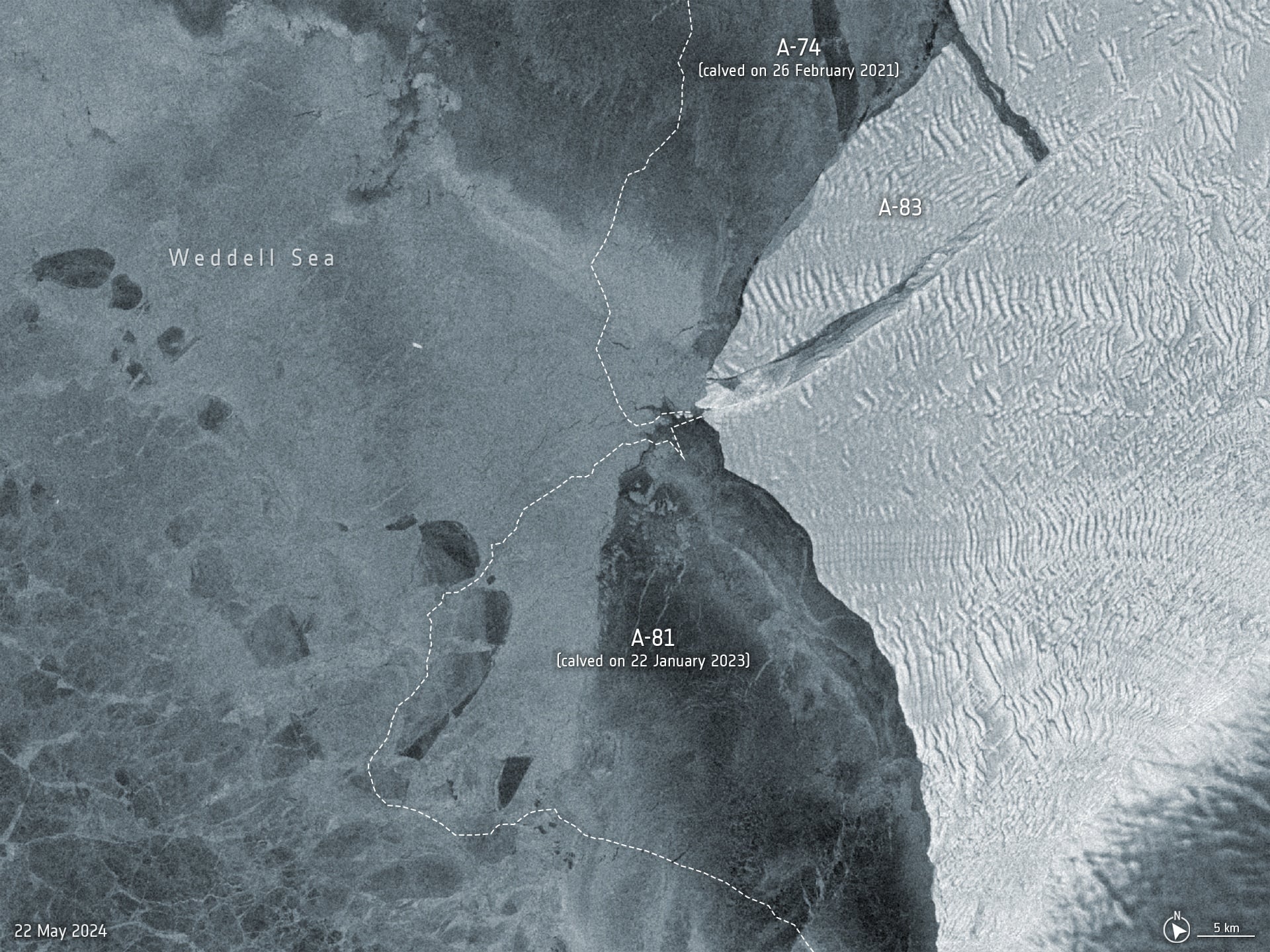 On May 20th, 2024, an iceberg measuring 380 square kilometers (~147 mi2) broke off the Brunt Ice Shelf in Antarctica. This event (A-83) is this region's third significant iceberg calving in the past four years. The first came In 2021, when A-74 broke off the ice sheet, while an even larger berg named A-81 followed in 2023. The separation of this iceberg was captured by two Earth Observation satellites - the ESA's Copernicus Sentinel-1 and NASA's Landsat 8 satellites - which provided radar imaging and thermal data, respectively.
