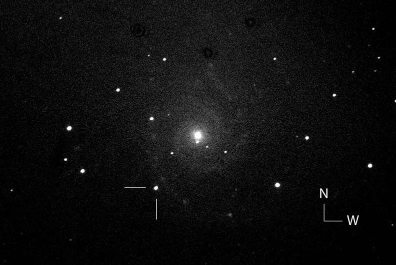 As additional photos and measurements come in, amateur astronomers with 8-inch and larger telescopes will have no problem spying the supernova once the last quarter moon departs the vicinity. It's located 93" (1.5') east and 135" (more than 2') southeast of the galaxy's core. The map and photo will help you track it down.