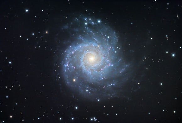 M74 is a classic spiral galaxy with arms that appear to unwind from a bright, star-packed nucleus. Located 32 million light years away in the constellation Pisces, M74 contains about 100 billion stars. The spiral arms are dotted with dense star clusters and pink clouds of fluorescing hydrogen gas. Credit: Jim Misti[/caption]