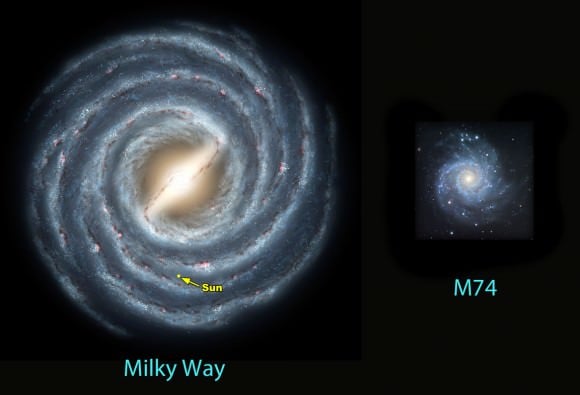 Size comparison of our Milky Way spiral galaxy with M74. The Milky Way measures about 100,000 light years across; M74 about 30,000. Credit: NASA (left) and Jim Misti[/caption]