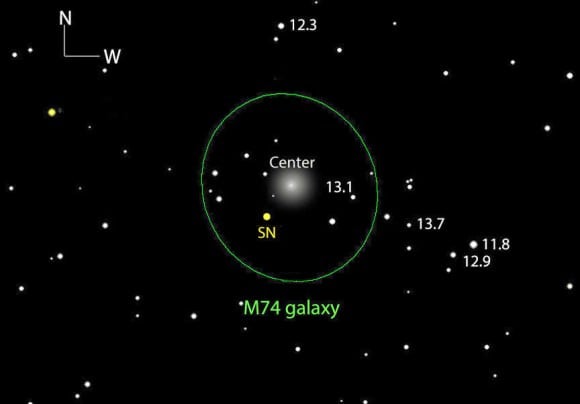 While M74 is relatively bright and appears spectacular in long-exposure photos, it looks like a large, dim featureless glow in smaller telescopes. Be patient and take your time to "star hop" to the supernova using the more detailed map. Matter of fact, you may want to wait until Tuesday morning or later to look. That's when the waning moon will finally depart the area. Let's hope our new guest remains bright.