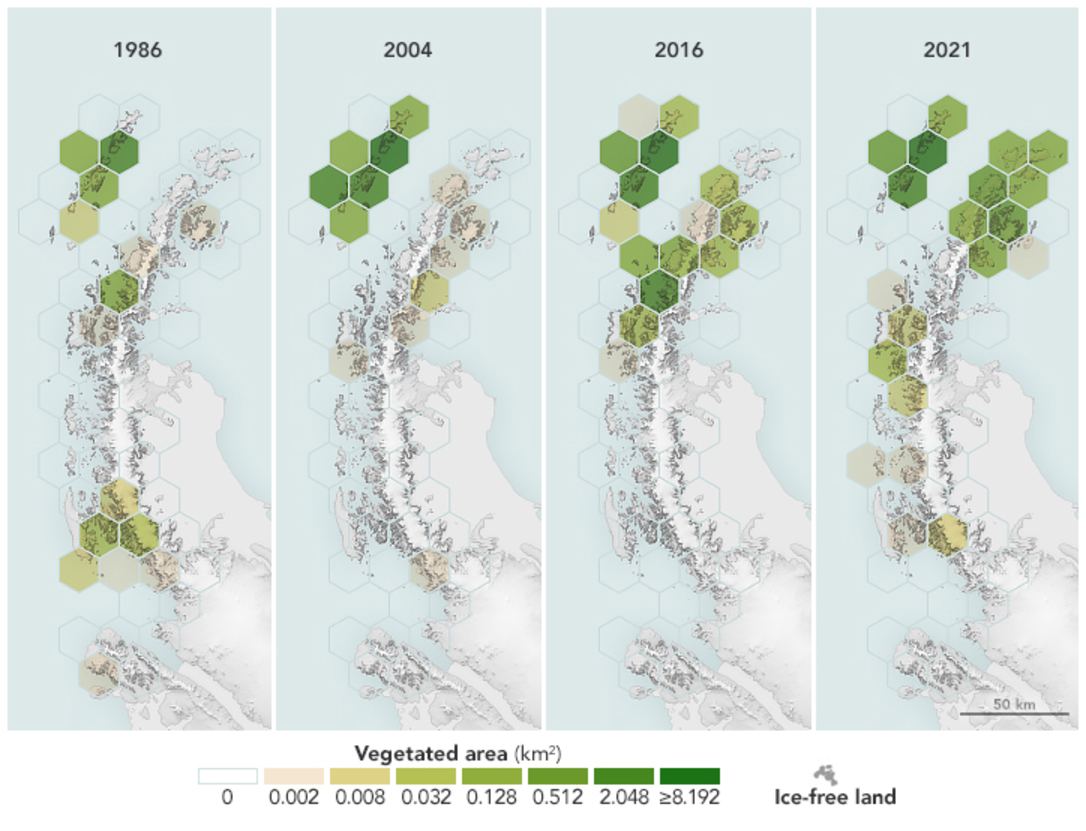 The map makes the results of the research clear. Each of the four panels show the amount of green vegetation on the Antarctic Peninsula's ice-free land below 300 meters (1000 ft) altitude. Each hexagon is shaded depending on how many sq. km. of it are covered in vegetation. That's determined by the satellite-based Normalized Difference Vegetation Index (NDVI). The NDVI is based on spectrometric data gathered by the Landsat satellites during cloud-free days every March, the end of the growing season in Antarctica.