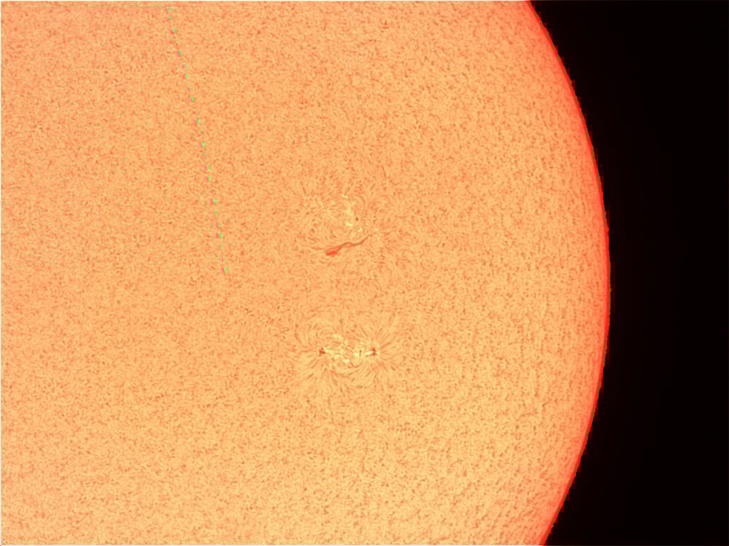 , showing spatial movement of the magnetic fields within the sunspot group, with one dark segment (south polarity, moving inward) and one bright segment (north polarity, moving outward). Remember that swirling action that Hale noted? Well, looking at the