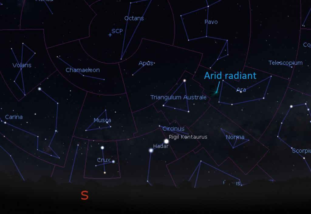 Early observations of the Arids late last month were promising. Specifically, SETI Institute and NASA Ames Research Center astronomer Peter Jenniskens, and T. Cooper and D. Lauretta of the Astronomical Society of South Africa and the University of Arizona respectively found an uptick of 13 meteors seen in NASA Ames' worldwide Cameras for All-Sky Meteor Surveillance (CAMS). These cameras were based in New Zealand and Chile, and caught the meteors hailing from the constellation Ara on the clear sky nights of 28-30 September. This is from debris ejected from Comet 15/P Finlay during its perihelion passage in 1995.