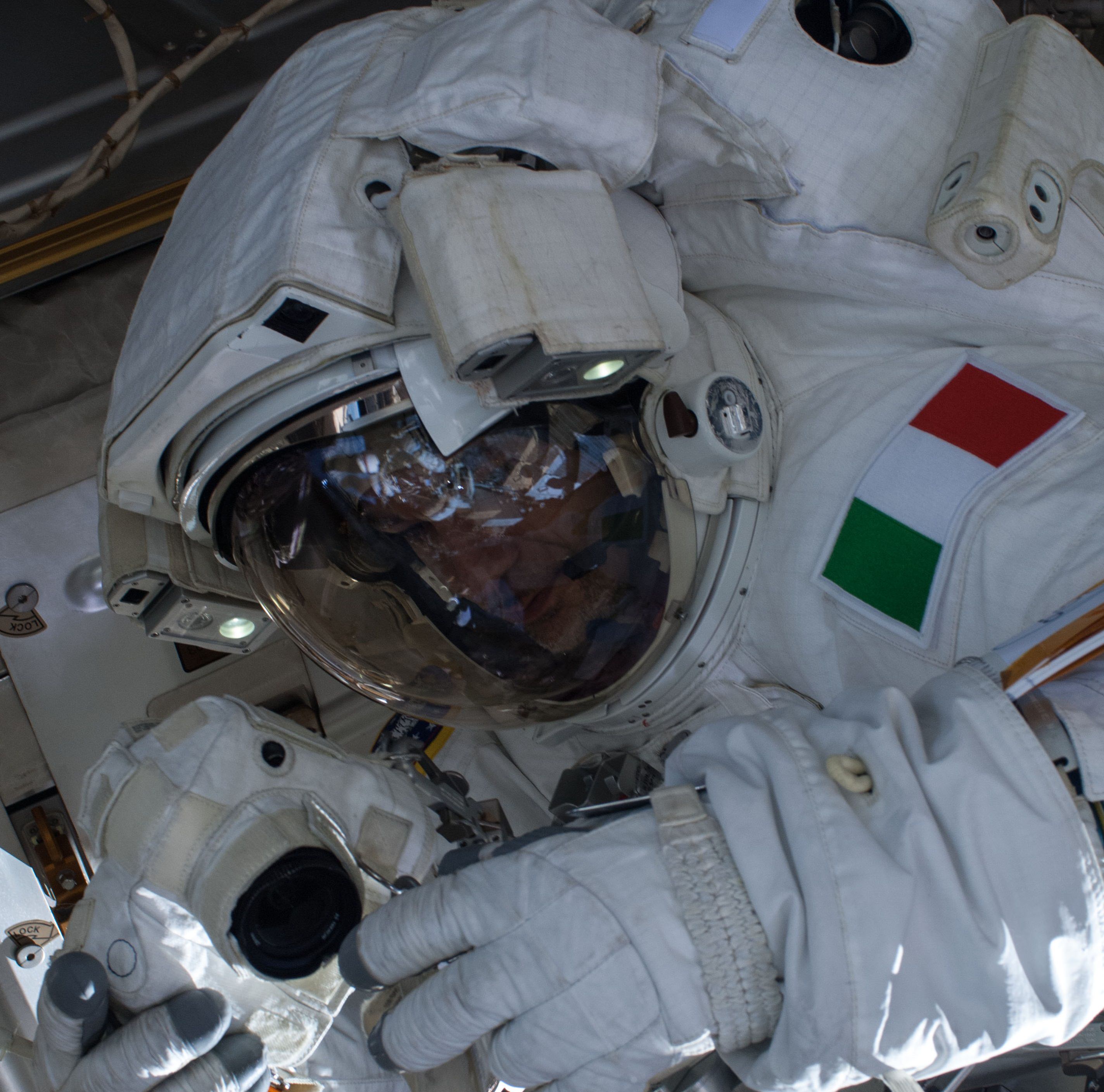 European Space Agency astronaut Luca Parmitano does spacesuit maintenance prior to July 9 and 16, 2013 spacewalks. Parmitano was a member of Expeditions 36 and 37. Credit: NASA[/caption]