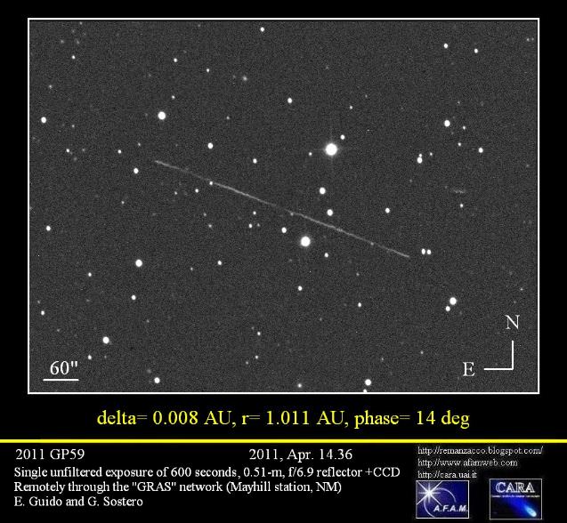 Guido & Sostero sent us a note that they imaged 2011 GP59 early on April 14, remotely from the GRAS Observatory (near Mayhill, New Mexico USA) through a 0.51-m, f/6.9 reflector + CCD.