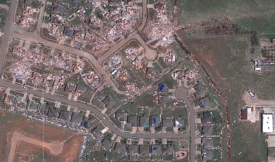 put this map together, using satellite data from Digital Globe, along with property data from City of Oklahoma City, City of Moore, and Cleveland County. Satellite data like this are helping to assist the recovery and rescue teams on the ground.