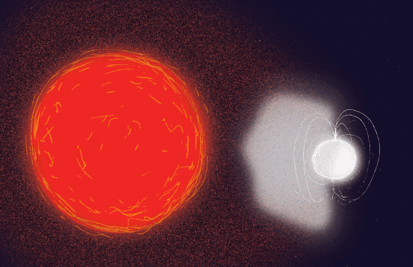 . "The red giant released a sufficiently dense slow wind to feed its neutron star companion, giving rise to high-energy emission from the dead stellar core for the first time."