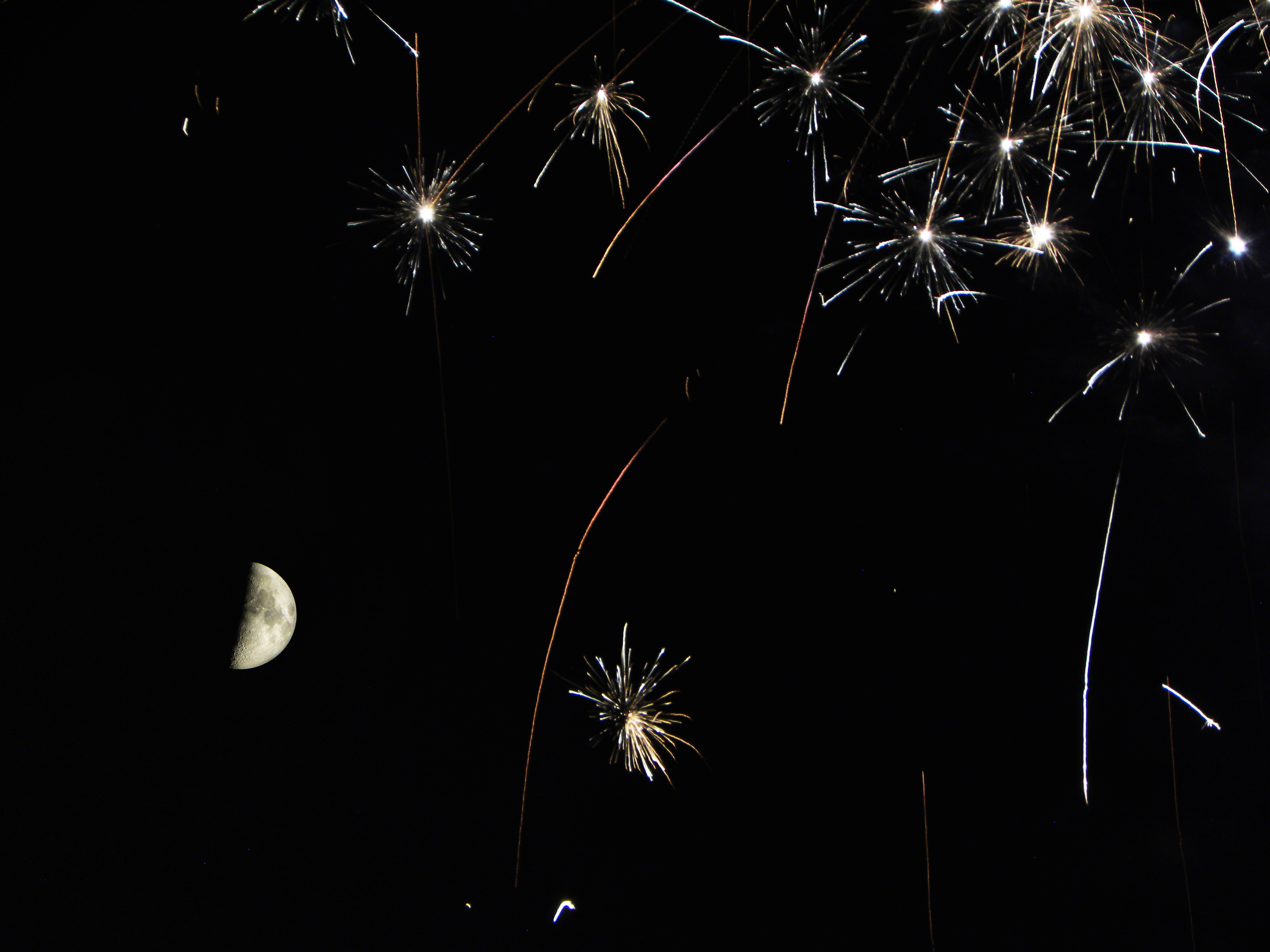 This lovely image of the Moon with fireworks exploding nearby in the sky was taken by astrophotgrapher Giuseppe Petricca over the weekend. "In Pisa, it was the Patron Saint's Day, and I managed to catch fireworks, launched from the middle of the river Arno, exploding near the first quarter Moon!" This is an actual shot -- not a mosaic -- and Guiseppe said he only used Photoshop to make the Moon's surface detail more clear and reduced the overall noise in the picture.