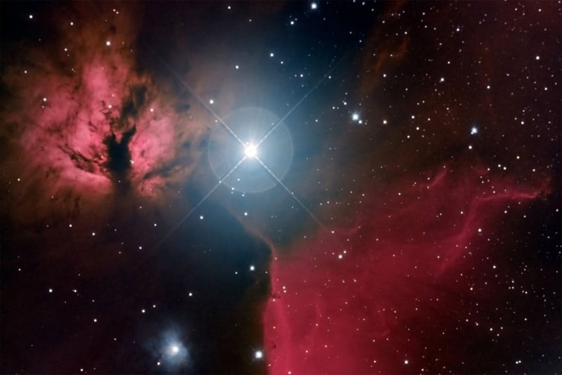 from Mexico captured this beautiful view of the star Alnitak and Flame Nebula, both in the constellation Orion. Alnitak is the southern star in Orion's belt, and is an extremely hot star, with a temperature of 29,500 ± 1000 K. It shines brilliantly, and is about 10,000 times more luminous than the Sun. This star also makes the Flame Nebula appear to be blazing, too. Wind and radiation from Alnitak blasts away electrons from the gas in the Flame nebula, causing it to become ionized and glow in visible light.