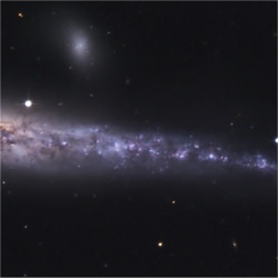 NGC 4631 is an enormous spiral galaxy about the same size as the Milky Way but, by chance, it is turned to us so that we only see its