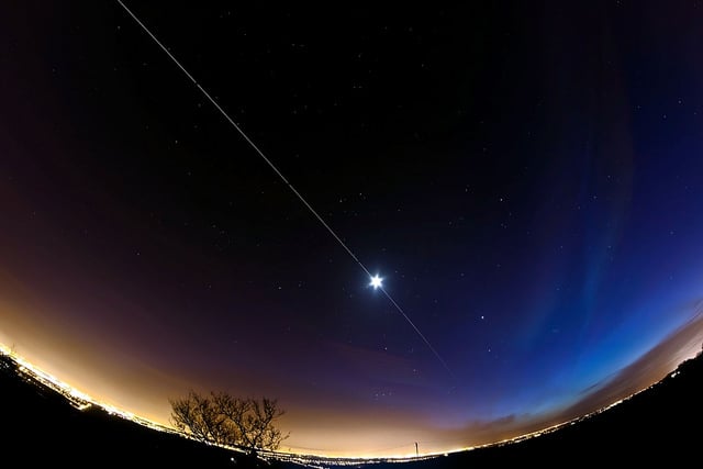 combined seven 30-second shots of the ISS as it cuts through the sky, and it appears to slice right through the Moon! Dave used a a Canon 600D, Samyang 8mm fish-eye lens, and Vixen Polarie.