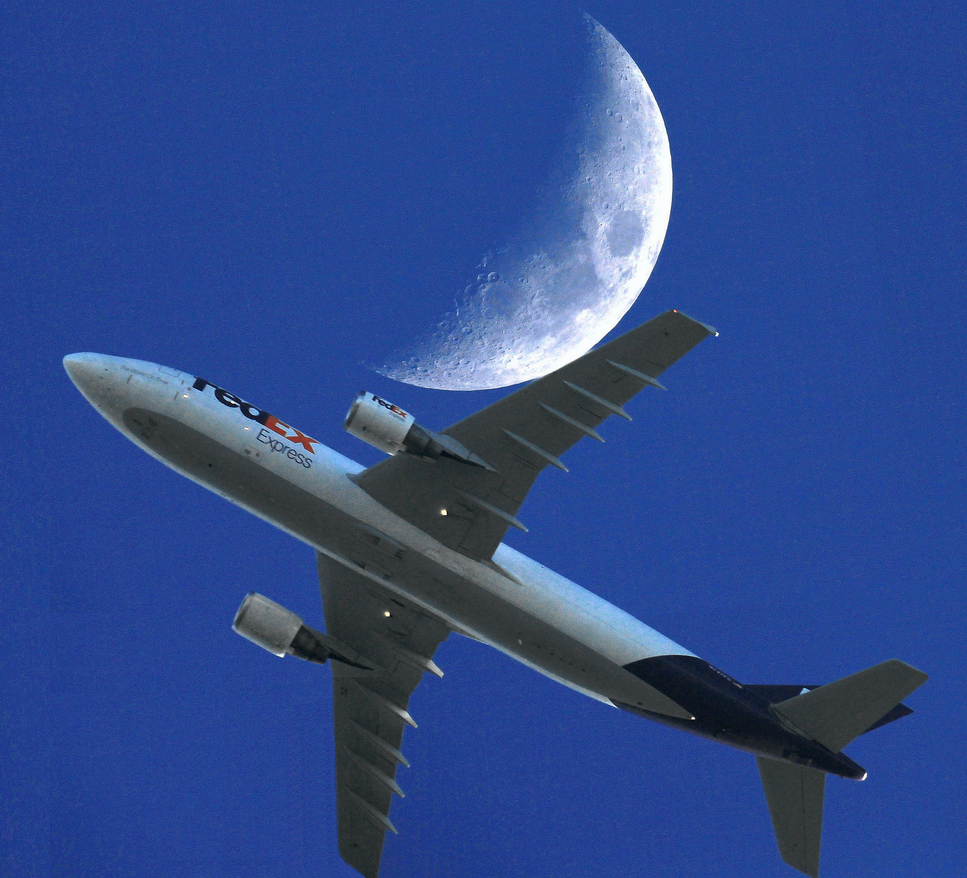 Fly me -- or my package -- to the Moon? "Anything is possible!" said astrophotographer Sebastien Lebrigand, via email to Universe Today. Lebrigand lives along the flight path to the Charles de Gaulle Airport in Paris and regularly takes images of planes flying in front of the Moon, (