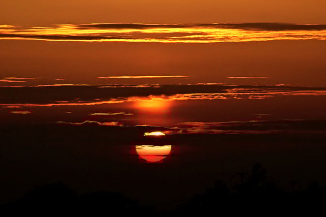Sunset on Tatooine? Nah, just an unusual combination of a dazzling orange sunset, clouds and a sun pillar that creates an "echo" effect of the setting Sun. As seen by astrophotographer