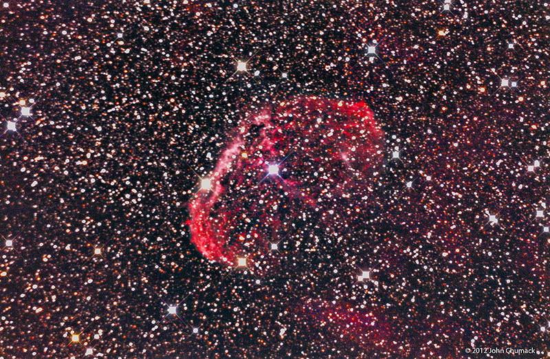 Here's an impressive shot of NGC 6888, also known as the Crescent Nebula, which is a cosmic bubble about 25 light-years across. It is part of the massive Gamma Cygni Nebula region, and in the center is a powerful, bright and massive Wolf-Rayet star. "The very energetic Wolf-Rayet star is shedding its outer envelope in a strong stellar wind, ejecting the equivalent of the Sun's mass every 10,000 years," explains prolific and talented astrophotographer John Chumack. "This cosmic bubble is located in this very rich star studded field, which is about 3,000 light years away."