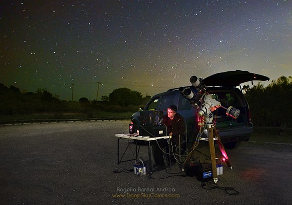Once he arrived there, he set up his impressive array of gear: dual telescopes and cameras, along with a tracking telescope and computers running specialized software. Andreo explains it best: