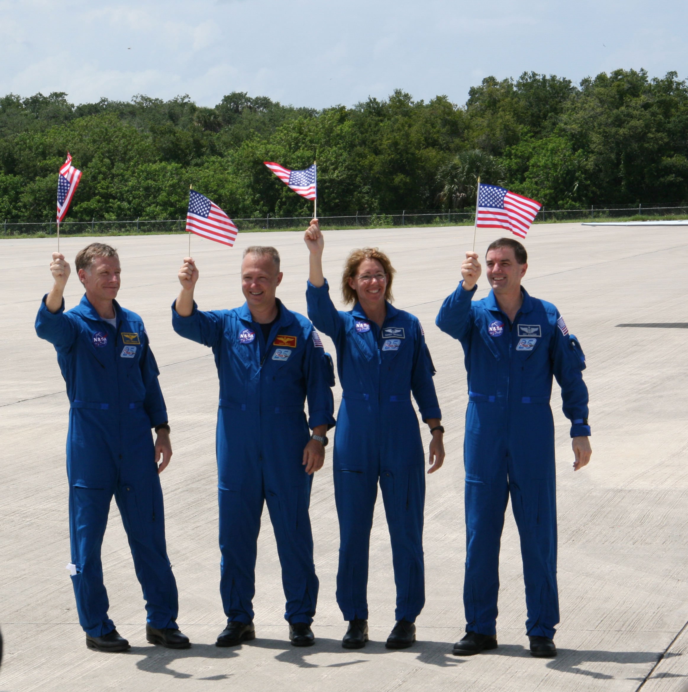 Upon landing in the sweltering Florida heat, the astronauts were welcomed by Space Shuttle Launch Director Mike Leinbach as well as other NASA/KSC officials and a large crowd of media. Many waved US flags in honor of the July 4th Independence Day holiday.