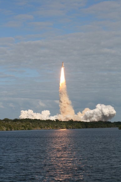 [/caption] As Atlantis rose on 7 million pounds of liftoff thrust following ignition of the 3 space shuttle main engines and twin solid rocket boosters we saw her rotate about her vertical axis. Atlantis swiftly rising exhaust trail was clearly visible for about three minutes as she ascended northwards up the east coast of the United States for her trek into the orbital plane of the International Space Station (ISS) and carefully choreographed link up in 2 days time.