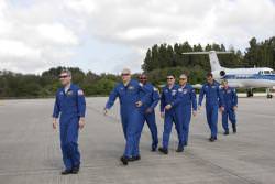 The astronaut crew arrived in Florida today, and the countdown is expected to begin later Monday afternoon. The weather might be a problem, however. Meteorologists are predicting that there's only a 40% chance of suitable weather on launch day. Friday should be better, though. Even if rain and clouds hold back the launch, there's an 80% chance the shuttle will be able to lift off at the end of the week.