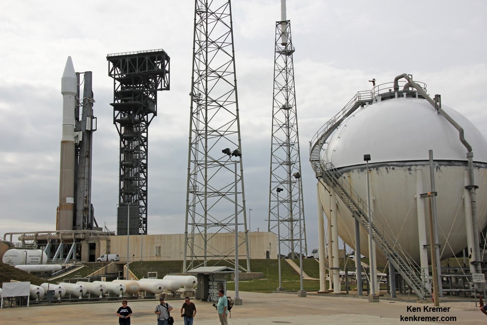 ULA Atlas V carrying UASF GPS navigation satellite is poised for blastoff on Feb. 5, 2016 from Space Launch Complex-41 at Cape Canaveral Air Force Station, Florida. Newly installed crew access tower stands to right of Atlas rocket. Credit: Ken Kremer/kenkremer.com[/caption]