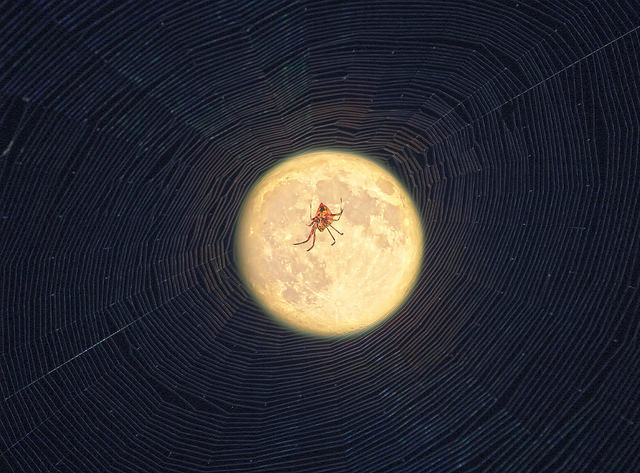 Up in the sky -- it's a bird, it's a plane... no, it's a spider and a SuperMoon! Well, not quite. This composite image by