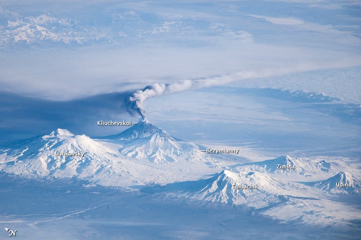 . While most of the views from space look straight down in a in a nadir view, this photo was taken from the International Space Station with an oblique or sideways viewing angle. This provides a three-dimensional-type view, similar to what might be seen from an airplane instead of a flattened view that looks straight down. This image was taken by an astronaut when the ISS was located over a ground position more than 1,500 kilometers (900 miles) to the southwest of the Kamchatka Peninsula in the far eastern part of Russia. The Kliuchevskoi volcano is just one of 160 volcanoes in this region, with 29 of the 160 being active.