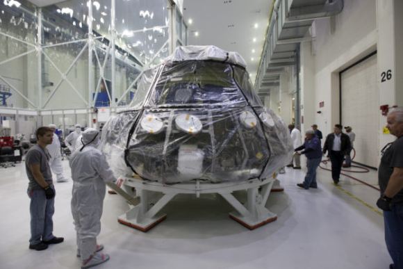 This images shows the Orion capsule wrapped in plastic after sterilization, and being moved to a workstand. These types of precautions are mandated by NASA's Office of Planetary Protection. Image: NASA.[/caption]