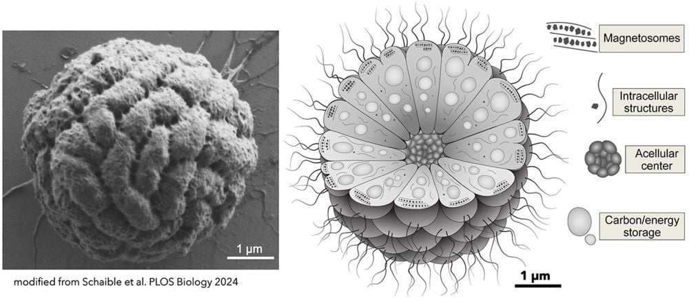 *This image and schematic show the detail in MMB. Individual cells are organized around an acellular center. Each cell contains a magnetosome, an intracellular organelle that holds iron inside a lipid membrane. The acellular center is material devoid of cells but still containing the extracellular matrix. Each cell has a compartment for energy and carbon storage. Intracellular structures in MMB are currently unidentified. Image Credit: George Schaible et al. PLOS Biology 2024*