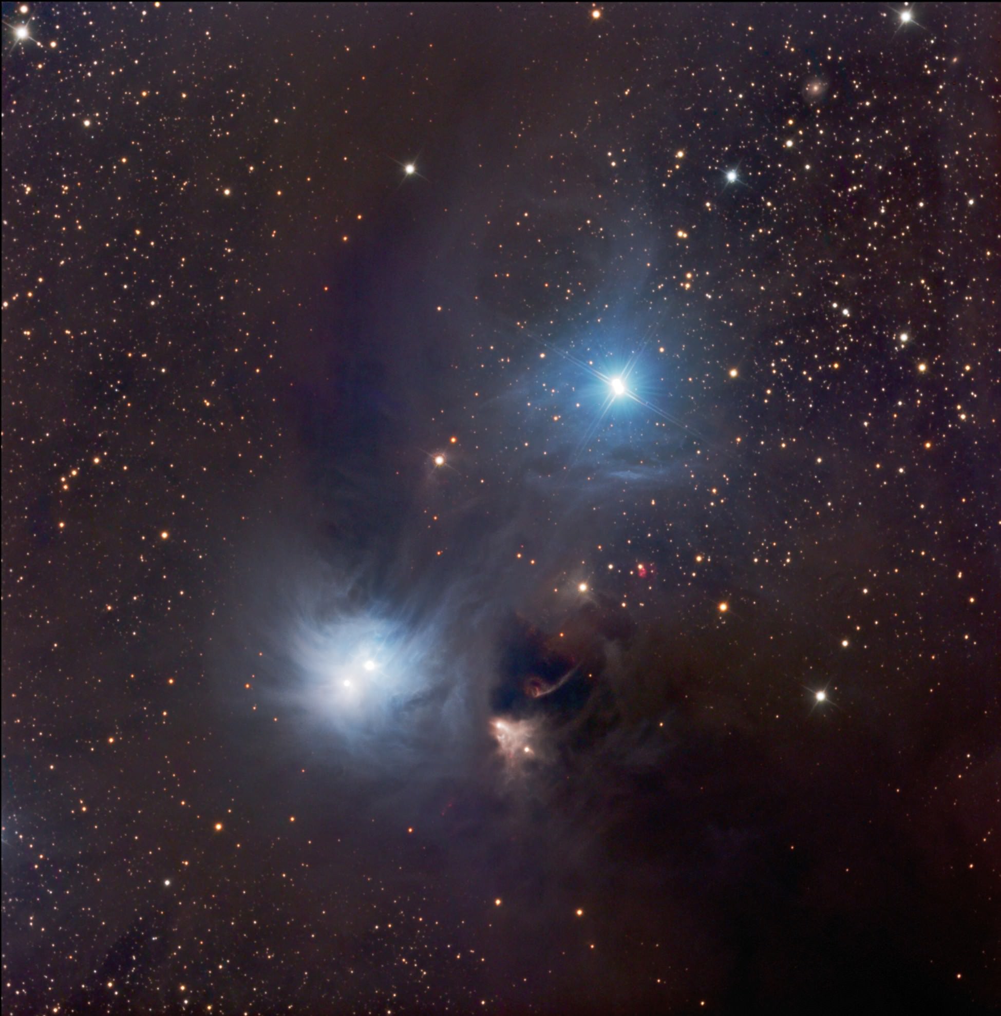 Buried in its yellowish cocoon near the two bright reflection nebulae, R CrA is a young star still accreting interstellar material on to its surface. But what materials? "The 3 micrometers absorption due to H2O ice was detected in three types of sources including protostars, T Tauri-like stars, and background field stars." says Masuo Tanaka (et al), "This scattered distribution suggests the significant contribution of the circumstellar hot dust to the H-K color and/or sublimation of H2O ice at the inner region of the circumstellar disk due to heating by protostars. Among them, the optical depth of CO ice in IRS 2 is the largest so far detected. It is found that the absorption feature of each source has almost the same central frequency and FWHM which coincide with the calculated values of small grains with dominant CO mantle. On the other hand, the column density of CO ice is found to be substantially smaller than that of H2O ice."