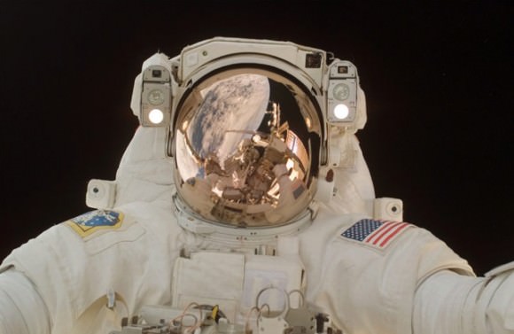 Mike Fossum, a mission specialist on STS-121, took this shot in July 2006. In the visor you can see space shuttle Discovery, part of the International Space Station and fellow crewmate Piers J. Sellers. Credit: NASA[/caption]