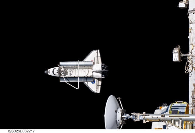 [caption id="attachment_83860" align="aligncenter" width="580" caption="A view of the docked space shuttle Discovery during the STS-133 mission, along with and the Canadian-built robot Dextre, and other parts of the ISS. Credit: NASA"]